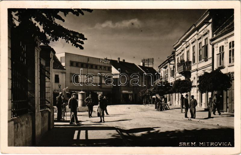 Leírás: 1941 Szávaszentdemeter, Mitrovice, Mitrovitz an der Save, Sremska Mitrovica; utcakp, üzletek, PADAK reklám / street view, shops, advertisement. photo (fl)