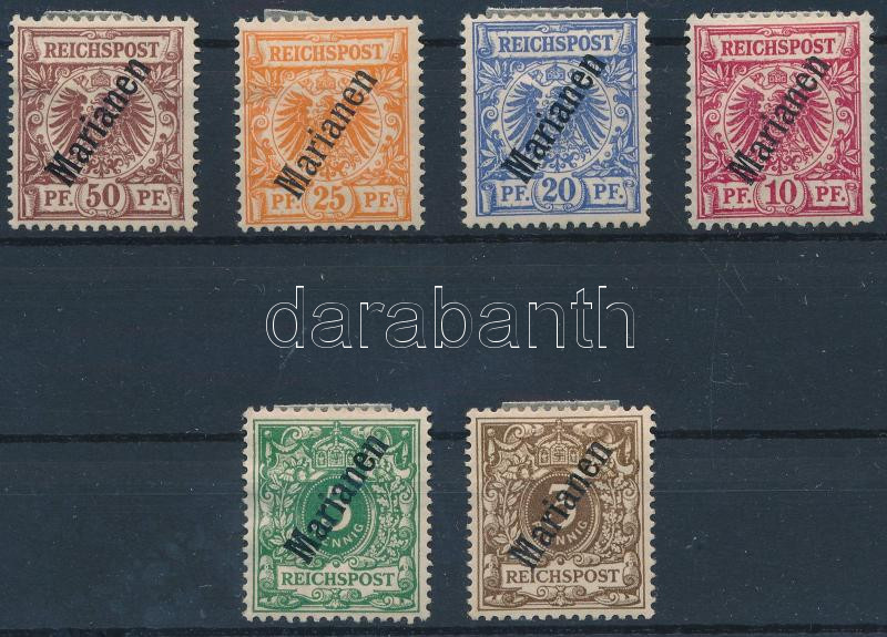 Marianen 1900 Mi 1-6 II (Mi EUR 230,-) https://www.darabanth.com/hu/513-Filatelia-kepeslap-numizmatika-mutargy-konyv-papirregiseg-ekszer-aukcio/513.0/Kiemelt-kulfoldi-filatelia-tetelek-es-gyujtemenyek/Egyes-kulfoldi-kiadasok-rendkivul-alacsony-kikialtasi-aron~8/Marianen-1900-Mi-1-6-II-Mi-EUR-230-~II3471659