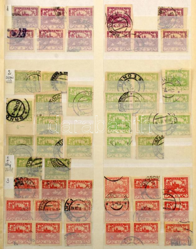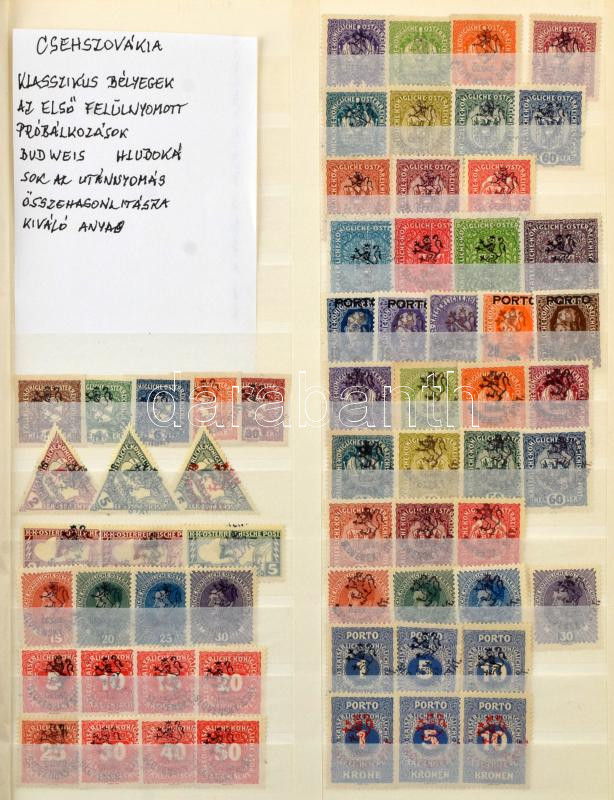Csehszlovákia 1918-1935 nagyrészt pecsételt több példányos készlet sok Hradzsinnal, benne klasszikus bélyegek, az első felülnyomott próbálkozások (Budweis, Hluboká), sok az utánnyomás. Összehasonlításra kiváló anyag, 9 lapos Schaubek rugós berakóban