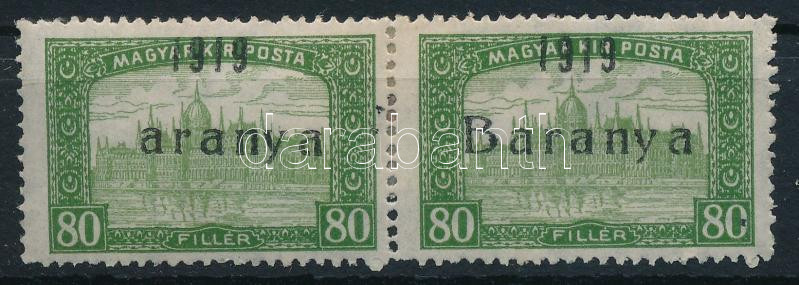 Leírás: Baranya I. 1919 Parlament 80f pár, a bal oldali bélyegen "aranya" tévnyomattal, Bodor vizsgálójellel