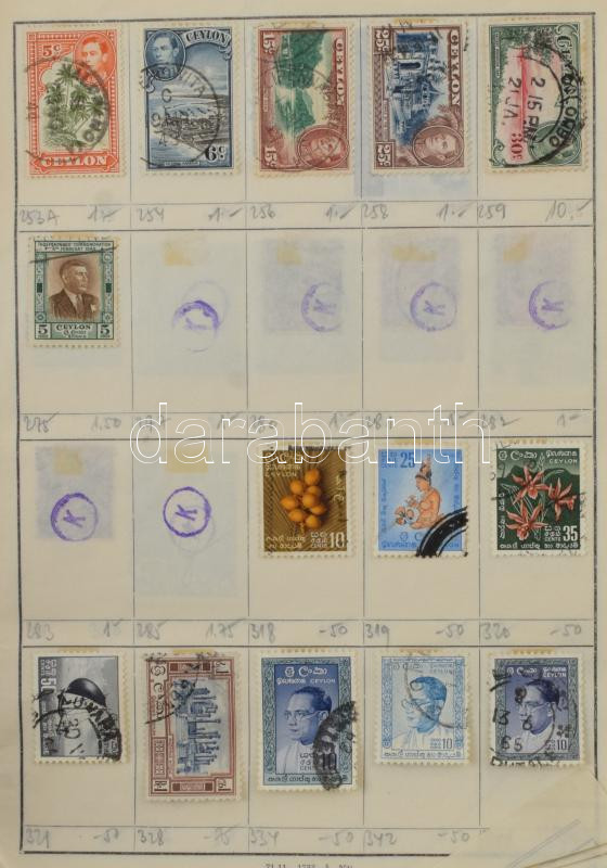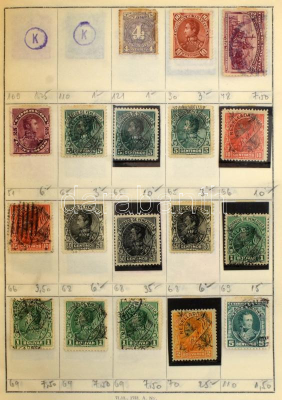 Leírás: Kb 4-5.000 db bélyeg 6 db cserefüzetben, változatos anyag, benne angol gyarmatok, USA, Peru, francia gyarmatok, Kolumbia, Venezuela