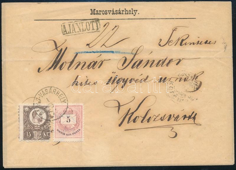 Leírás: 1875.szept.01. 2. súlyfokozatú ajánlott levél Réznyomat 15kr + Színesszámú 5kr vegyes bérmentesítéssel "MAROS-VÁSÁRHELY" - "KOLOZSVÁR" RRR!