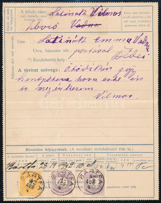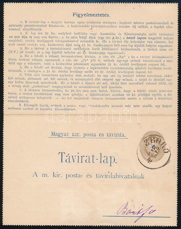 1892 Táviratlap 2x 2kr + 8kr díjkiegészítéssel, "ZBORÓ" - &q... https://www.darabanth.com/hu/513-Filatelia-kepeslap-numizmatika-mutargy-konyv-papirregiseg-ekszer-aukcio/513.0/Kiemelt-magyar-filatelia-tetelek-es-gyujtemenyek/Egyes-magyar-kiadasok-rendkivul-alacsony-kikialtasi-aron~1/1892-Taviratlap-2x-2kr-plus-8kr-dijkiegeszitessel-ZBORO-BARTFA~II3466929