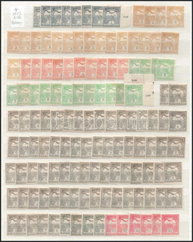 1913 Turul sor álló vízjellel + sok másodpéldány, hozzá 10 érték fekvő vízjellel, 2 db A/4-es berakólap 2 oldalán (a sor és a koronás értékek: 101.300)
