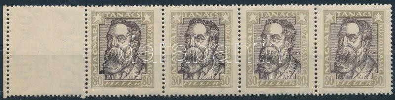 Leírás: 1919 Magyar Tanácsköztársasági arcképek 80f ívszéli négyescsík üres mezővel, álló vízjellel (84.000)