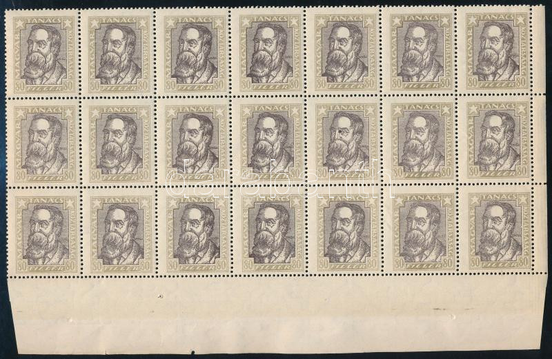 Leírás: 1919 Magyar tanácsköztársasági arcképek 80f ívszéli 21-es tömb álló vízjellel, lemezhibákkal (168.000) (1 bélyegen halvány gumihiba, néhány bélyegen kis törések / light gum disturbance, small folds)