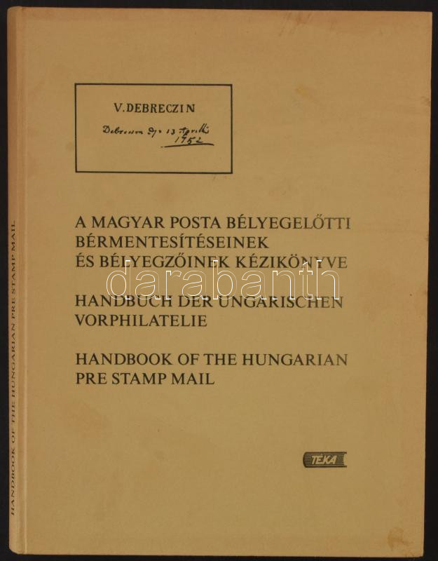 A magyar posta bélyegelőtti bérmentesítéseinek és bélyegzőinek kézikön... https://www.darabanth.com/hu/513-Filatelia-kepeslap-numizmatika-mutargy-konyv-papirregiseg-ekszer-aukcio/513.0/Kiemelt-magyar-filatelia-tetelek-es-gyujtemenyek/Katalogusok-szakirodalom~13/A-magyar-posta-belyegelotti-bermentesiteseinek-es-belyegzoinek-kezikonyve3Cbr-3E-erosen-~II3466443