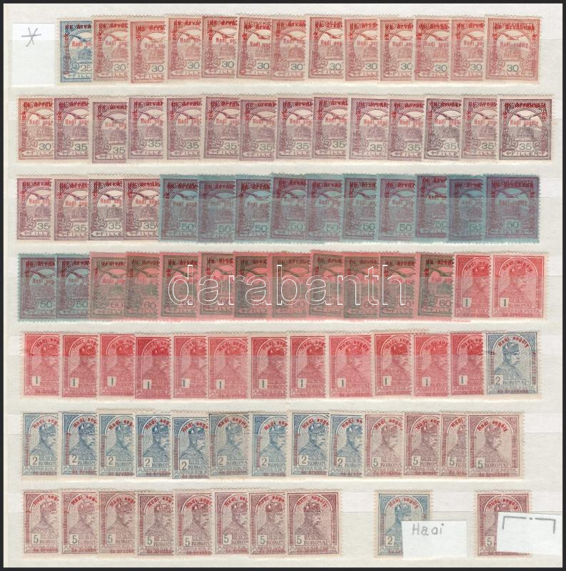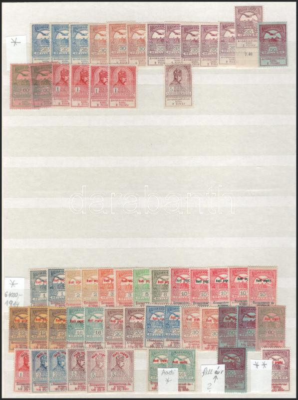 Leírás: 1913-1915 Árvíz I., Hadisegély I-II. bélyegek, köztük teljes sorok, "Aadi" és más lemezhibák, 3 db A/4-es berakólap 4 oldalán
