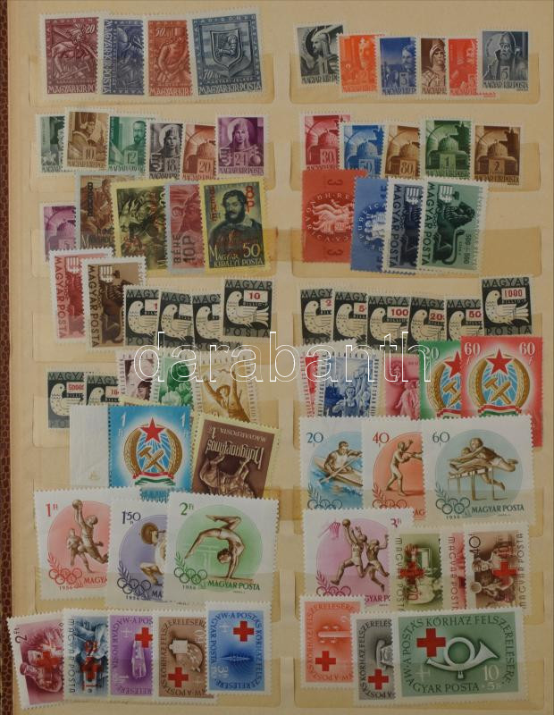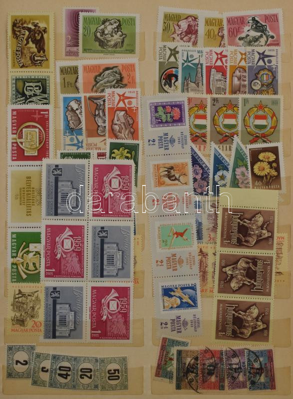 Rendezetlen magyar tétel, régi és modern értékek vegyesen, sorokkal, blokkokkal, összefüggésekkel, 2 db berakóban és 3 db albumban, hozzá régi naptár beleragasztott modern bélyegekkel. Böngészde!