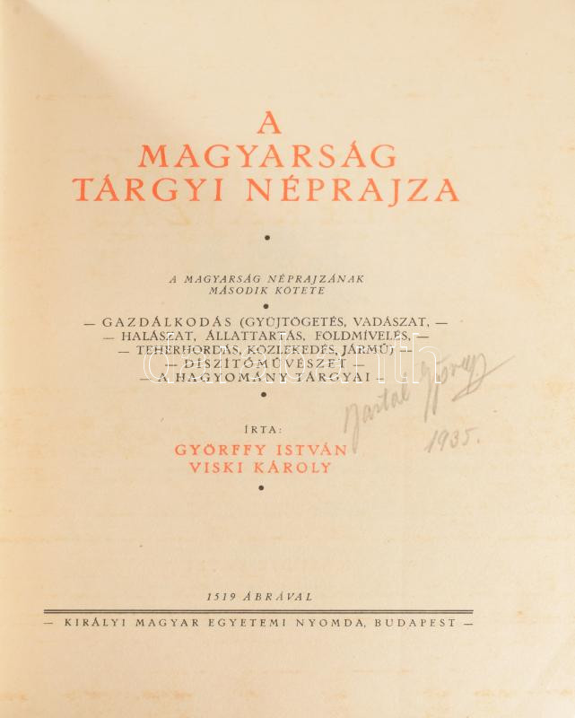 A magyarság néprajza. I-IV. kötet. Szerk.: Czakó Elemér. I-II. kötet: Bátky Zsigmond,Győrffy István,Viski Károly: A magyarság tárgyi néprajza. III-IV. kötet: Berze-Nagy János,Kodály Zoltán, Lajtha László, Szendrey Zsigmond, Viski Károly és mások: A magyarság szellemi néprajza. Bp.,én. Kir. M. Egyetemi Nyomda. Kiadói aranyozott félbőr kötések, kis kopással