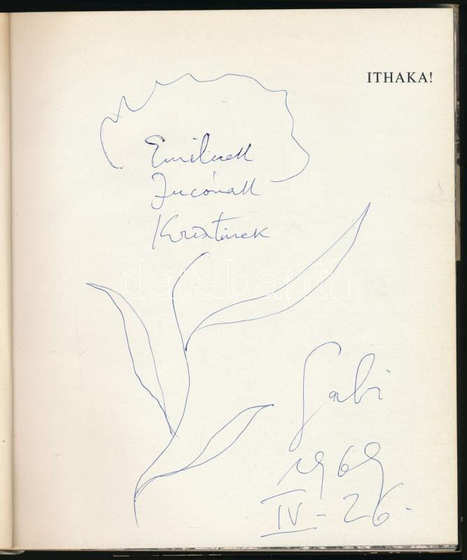 Gink Károly - Devecseri Gábor: Ithaka! - - fotó. - - versei és fordításai. Az egyik szerző, Devecseri Gábor (1917-1971) költő, író rajzos DEDIKÁCIÓJÁVAL, dátumozva (1969. IV. 26., valamint Gink Károly fotójánál ("Ez Gink Karcsi, nem én!") Bp., 1969, Magvető. Kiadói egészvászon-kötés, szakadt kiadói papír védőborítóban.