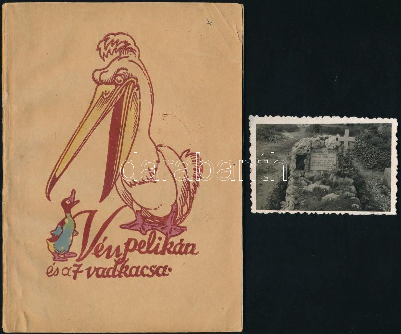 Haranghy JenÅ‘: Vén pelikán és a 7 vadkacsa. Vidám és igaz történetek a régi pesti állatkertbÅ‘l. A gyermekek számára elmondja és rajzolta - - . Olcsó Mesekönyvek I. [Bp., 1947], SzépmÃves Műhely, 30 p. Kiadói papÃrkötés, kissé viseltes borÃtóval. + Haranghy JenÅ‘ (1894-1951) festÅ‘művész sÃrját ábrázoló fotó, 6x9 cm
