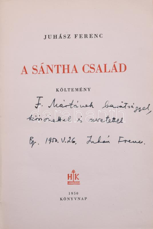 Juhász Ferenc: A Sántha család. Dedikált, első kiadás. Bp., 1950. Hung... https://www.darabanth.com/hu/513-Filatelia-kepeslap-numizmatika-mutargy-konyv-papirregiseg-ekszer-aukcio/513.0/Konyvek/Konyvek-Egyeb-ritkasagok~175/Juhasz-Ferenc-A-Santha-csalad-3Cstrong3EDedikalt-elso-kiadas3Cstrong3E-Bp-1950-Hungaria-~II3466796