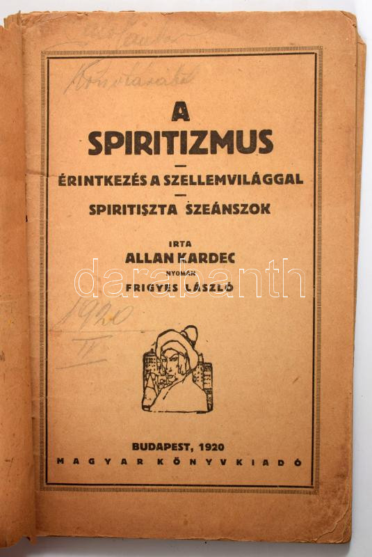 Kardec, Allan: A spiritizmus. Érintkezés a szellemvilággal. Spiritiszta szeánszok. Irta - - nyomán Frigyes László. Bp., 1920, Magyar Könyvkiadó, 63+(3) p. Kiadói papÃrkötés, erÅ‘sebben sérült, a gerincen javÃtott borÃtóval, néhány sérült lappal, az utolsó lap kijár.
