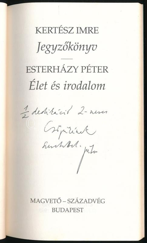 Kertész Imre: Jegyzőkönyv. / Esterházy Péter: Élet és Irodalom. Az egyik szerző, Esterházy Péter (1950-2016) Kossuth- és József Attila-díjas író által DEDIKÁLT példány. "1/2 dedikáció 2-szeres. Csöpikének Szeretettel: Péter. Bp., 1993, Magvető - Századvég, 71+7 p. Kiadói papírkötés, jó állapotban.