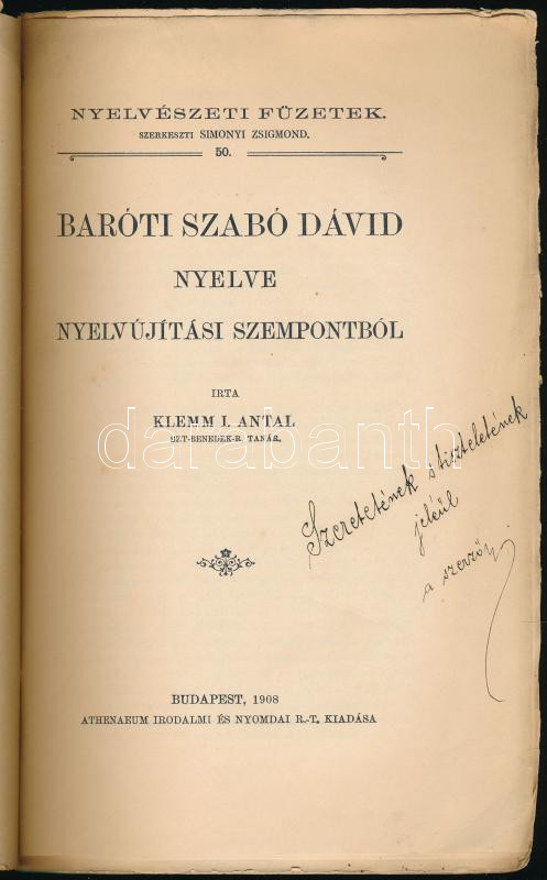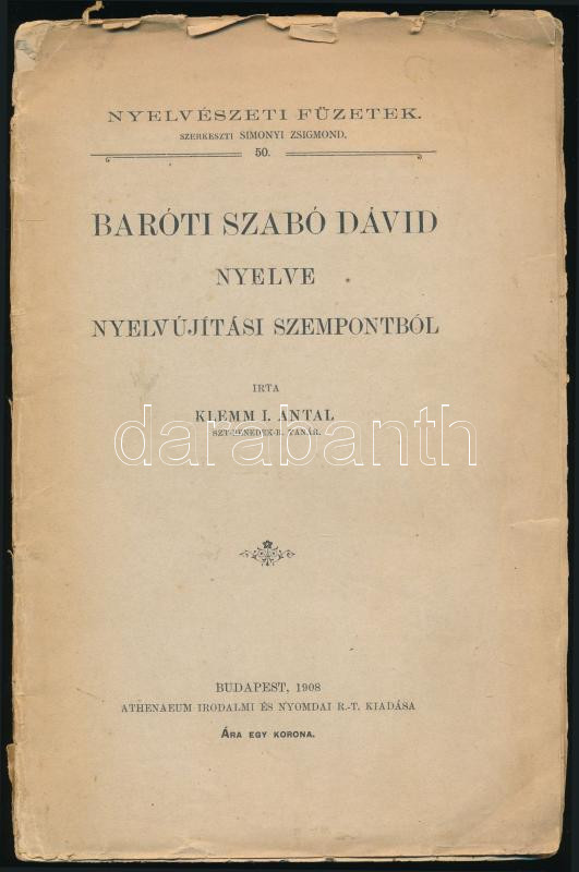 Klemm I. Antal: Baróti Szabó Dávid nyelve nyelvújítási szempontból Bp.... https://www.darabanth.com/hu/513-Filatelia-kepeslap-numizmatika-mutargy-konyv-papirregiseg-ekszer-aukcio/513.0/Konyvek/Konyvek-Egyeb-ritkasagok~175/Klemm-I-Antal-Baroti-Szabo-David-nyelve-nyelvujitasi-szempontbol-Bp-1908-Athenaeum-70p~II3467819