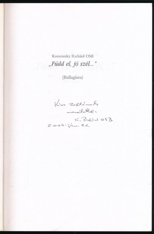 Leírás: Korzenszky Richárd: Fúdd el, jó szél... (Ballagásról.) DEDIKÁLT! Tihany, 2000, Bencés Apátság. Kiadói papírkötés.