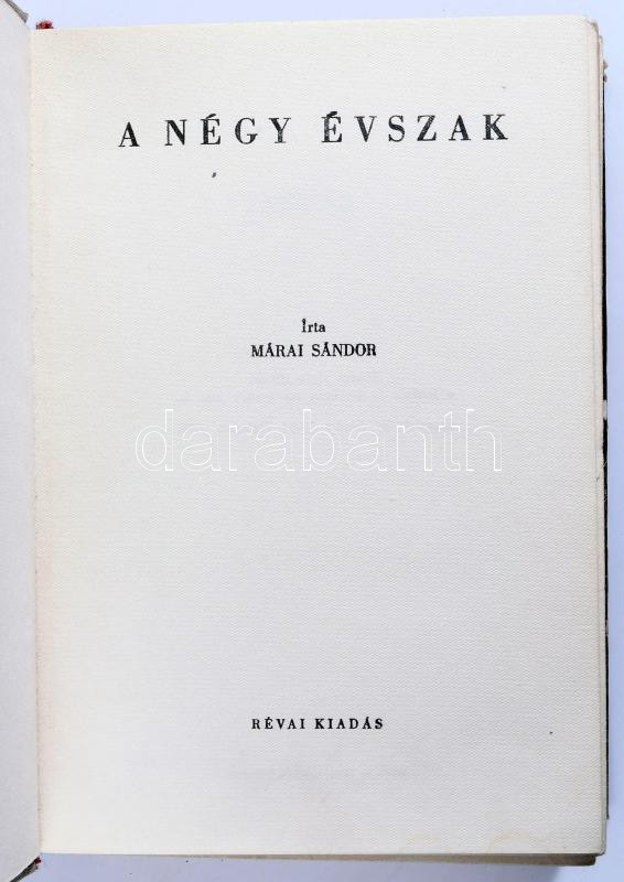 Márai Sándor: A négy évszak. Bp., 1938, Révai. Kiadói egészvászon köté... https://www.darabanth.com/hu/513-Filatelia-kepeslap-numizmatika-mutargy-konyv-papirregiseg-ekszer-aukcio/513.0/Konyvek/Konyvek-Egyeb-ritkasagok~175/Marai-Sandor-A-negy-evszak-Bp-1938-Revai-Kiadoi-egeszvaszon-kotes-serult-papir~II3470162