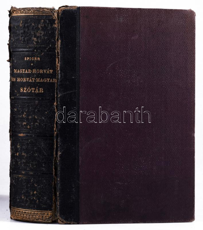 Leírás: Spicer Mór: Magyar-horvát és horvát-magyar szótár. I. rész: Magyar-horvát. Közhasználatra összeállította: - - . Bp., 1893, Franklin-Társulat, 4 sztl. lev.+ 397+(3) p Korabeli kissé sérült félbőr kötésben
