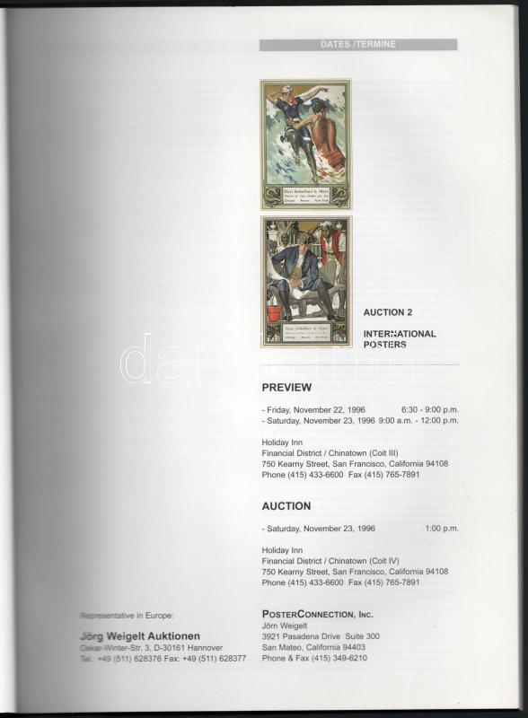 PosterConnection, Inc. Auction 2. International Posters. (Aukciós katalógus, nemzetközi plakátok témában.) Hannover, 1996, PlakatKonzepte Grohnert & Weigelt. Gazdag képanyaggal illusztrálva. Angol és német nyelven. Kiadói papírkötés.