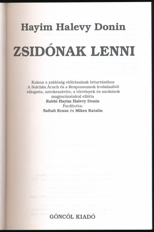 Leírás: Hayim Halevy Donin: Zsidónak lenni. Kalauz a zsidóság előírásainak betartásához. Ford.: Naftali Kraus és Mikes Katalin. Bp., 1998, Göncöl, 286+(2) p. Kiadói papírkötés.