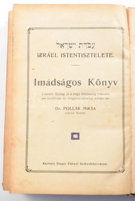 Imádságos Könyv a tanuló ifjuság és a nagy közönség számára fordította és magyarázatokkal ellátta Dr. Pollák Miksa soproni főrabbi. Sopron, é.n., k.n. Kiadói sérült egészvászon-kötés, a belső borítón gyermekrajzokkal.