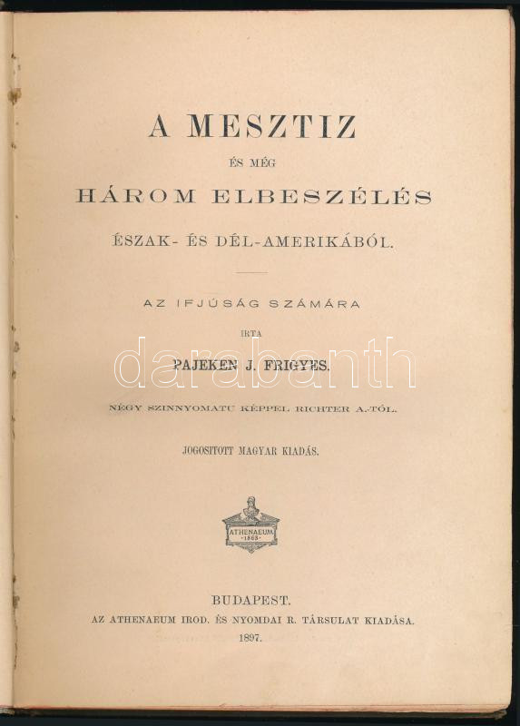[Pajeken, Friedrich Joachim] Pajeken J. Frigyes: A mesztiz és még három elbeszélés Észak- és Dél-Amerikából. Az ifjuság számára írta - - . Bp., 1897, Athenaeum, 155 p.+ 3 (színes litográfiák) t. Kiadói illusztrált egészvászon-kötés, Gottermayer-kötés, kissé viseltes állapotban, kopottas borítóval és gerinccel, helyenként kissé sérült, foltos lapokkal, egy javított lappal, ajándékozási bejegyzéssel.