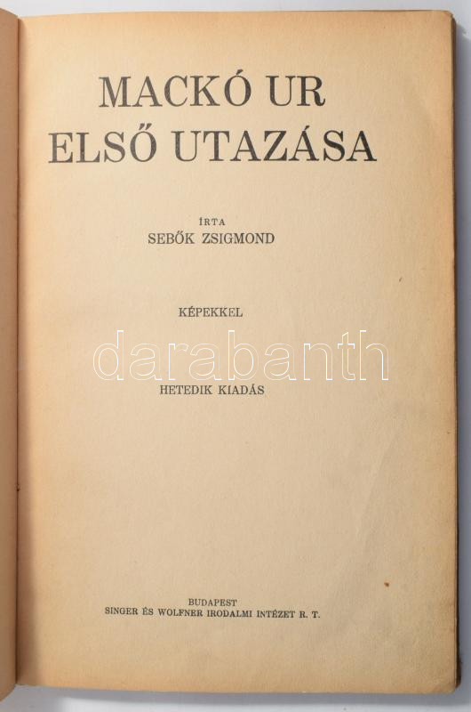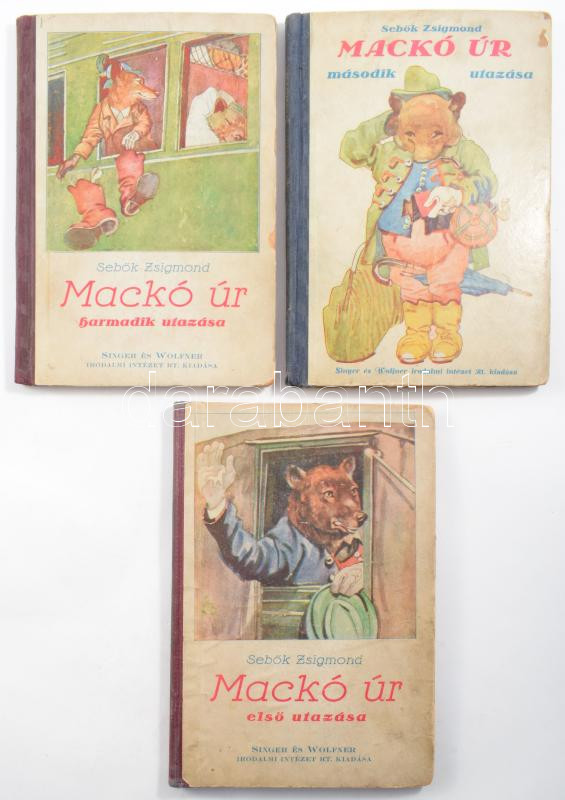 Sebők Zsigmond: Mackó úr első utazása.; Mackó úr második utazása.; Mackó úr harmadik utazása. (3 kötet.) Bp., 1932/é.n., Singer és Wolfner, 47+(1) p.; 79+(1) p.; 48 p. Kiadói félvászon-kötés, változó állapotban, kissé viseltes borítókkal.