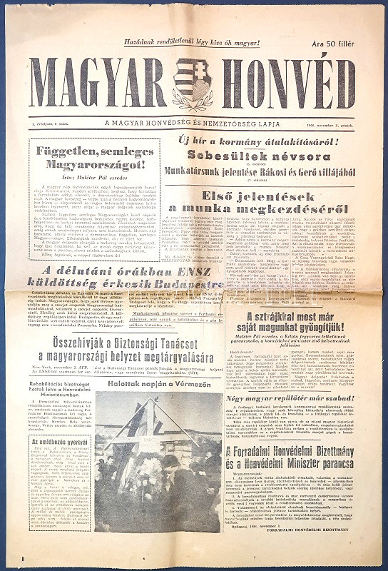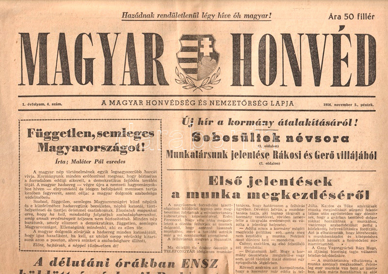 A Nagy Imre-kormányt támogató honvédségi lap a forradalom politikai és honvédelmi híreit közli.