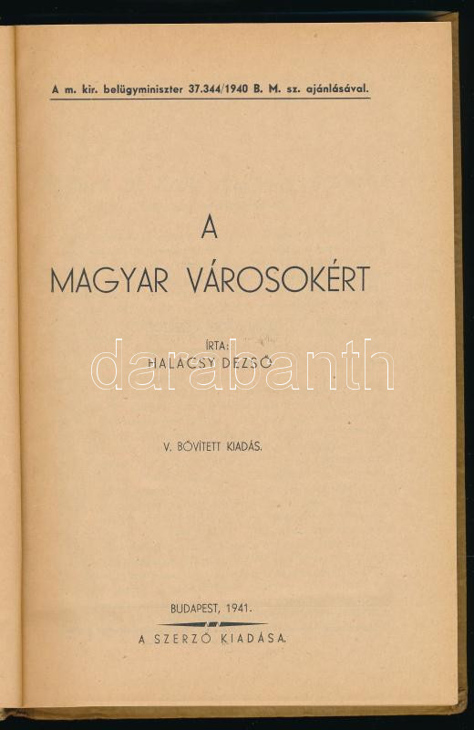 Halácsy Dezső: A magyar városokért. A M. Kir. Földmívelésügyi Minisztérium Gazdasági Szakkönyvei 50. sz. Bp., 1941, szerzői kiadás, 248 p. Kiadói félvászon-kötés.