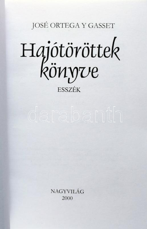 Leírás: José Ortega y Gasset: Hajótöröttek könyve. Vál.: Schlolz László. Ford.: Csejtei Dezső, Scholz László. Bp., 2000, Nagyvilág. Kiadói papírkötés.