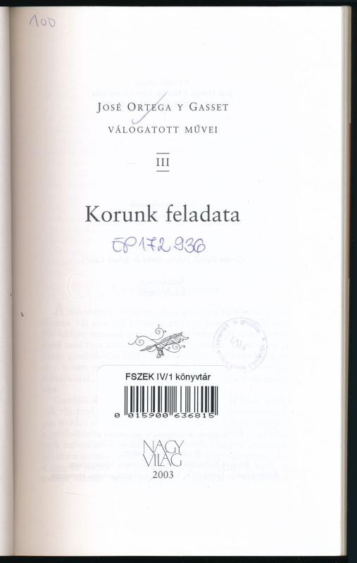 José Ortega y Gasset: Korunk feladata. Ford.: Csejtei Dezső, Juhász Anikó és Scholz László. José Ortega y Gasset Válogatott művei III. Nagyvilág esszék. Bp., 2003,Nagyvilág Kiadó, 191 p. Kiadói papírkötés, volt könyvtári példány.