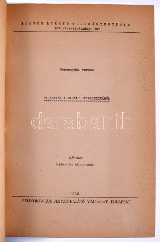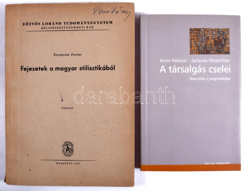 Leírás: Reboul, Anne - Moeschler, Jaques: A társalgás cselei. Bevezetés a pragmatikába. Ford.: Gécseg Zsuzsanna. Osiris Könyvtár. Nyelvészet. Bp.,2005., Osiris. Kiadói papírkötés + Terestyéni Ferenc: Fejezetek a magyar stilisztikábók. Kézirat. ELTE BTK. Bp., 1958, Felsőoktatási Jegyzetellátó. Kiadói papírkötés, a gerincen kis sérüléssel.