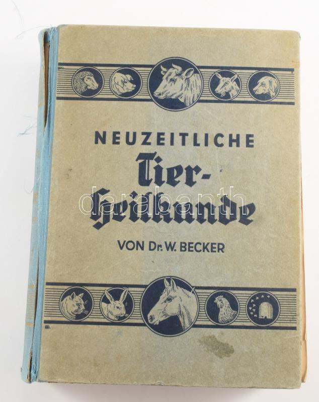 Becker, W.: Neuzeitliche Tierheilkunde. Handbuch der Gesundheitspflege, Zucht, Geburtshilfe, des Hufbeschlages usw. unserer Haustiere. Leipzig, 1941, Ernst Wiest Nachfolger, XX+1150+(8) p. Oldalszámozáson kívül színes táblákkal, köztük anatómiai mellékletekkel. Német nyelven. Kiadói félvászon-kötés, sérült gerinccel.