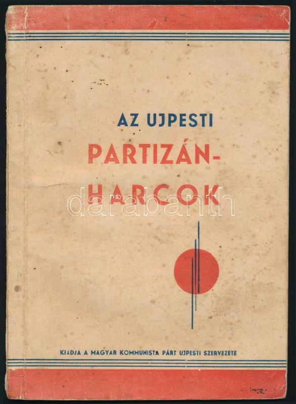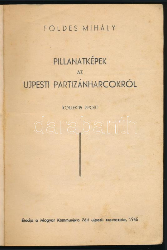 Földes Mihály: Pillanatképek az újpesti partizánharcokról. KollektÃv riport. [Bp.], 1945, Magyar Kommunista Párt Újpesti Szervezete (Újpest, Szabadság-ny.), 49+(1) p.+ 2 t. Kiadói papÃrkötés, foltos borÃtóval, helyenként foltos lapokkal.