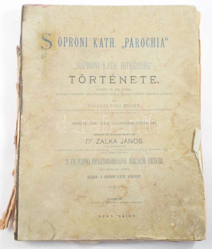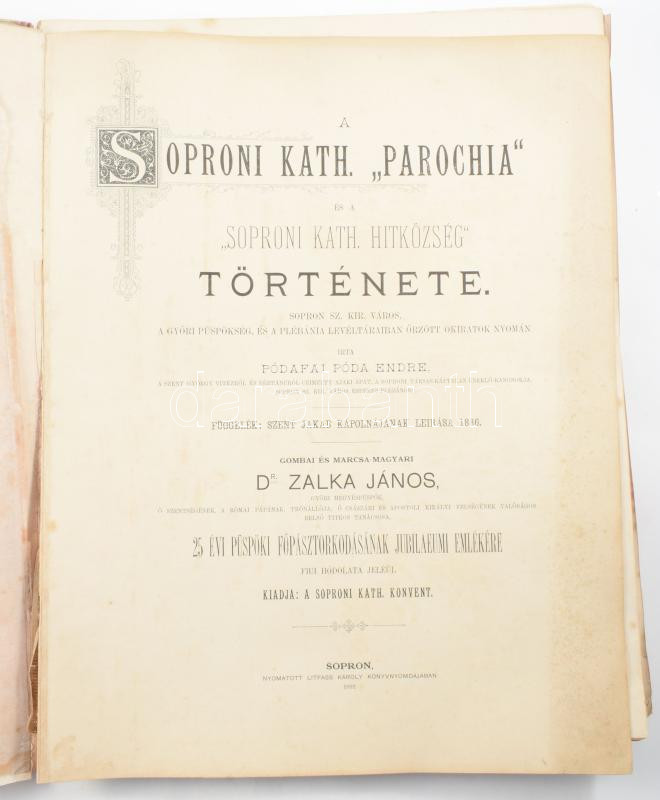 Póda Endre, pódafai: A soproni római kath. ,,parochia" és a ,,soproni kath. hitközség" története. Sopron sz. kir. város, a győri püspökség, és a plébánia levéltáraiban őrzött okiratok nyomán írta: - - . Függelék: Szent Jakab kápolnájának leírása 1886. Sopron, 1892, Soproni Kath. Konvent (Litfass Károly-ny.), 6 sztl. lev.+ 169+(3) p.+ 8 t.; XXVI p.+ 9 t. Kiadói félvászon-kötés, széteső, rossz állapotban, hiányzó gerinccel, kijáró lapokkal, 3 hiányzó táblával.