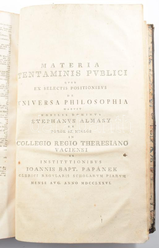Papánek, Joannes Bapt[ista]: Materia tentaminis publici, quod ex selectis positionibus de universa philosophia habuit? Stephanus Almásy? in Collegio? Theresiano Vaciensi ex institutionibus ? ? ?mense Aug[usto] anno 1776.(Vacii 1776, Ambro. [14] lev
