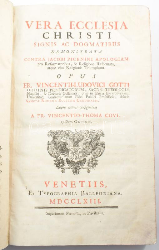 Gotti, Vincenzo Ludovico.: Vera ecclesia Christi signis ac dogmatibus demonstrata contra Jacobi Picenini appologiam pro Reformatoribus, & Religione Reformata, atque ejus ReligionisTriumphum. Venetiis 1763. Ex Typographia Balleoniana, ,532p., 28 p. + hozzákötve: