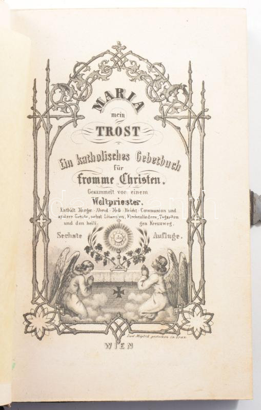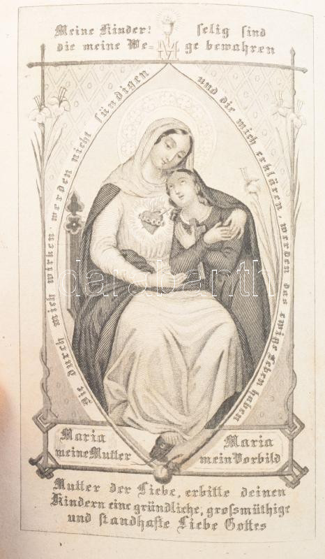 Maria mein Trost. Ein katholisches Gebetbuch für fromme Christen. Gesammelt von einem Weltpriester. Wien, é.n. J. Wallner, o.J. (um 1860) 344 + 8 p. Litografált illusztrációkkal. Korabeli bársony kötésben, fém rátétekkel, aranyozott lapszélekkel, szép állapotban