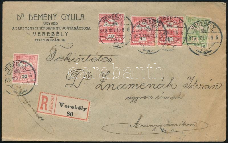 Leírás: 1913 2. súlyfokozatú ajánlott levél kiállítási minőségben, "VEREBÉLY" - "ARANYOSMARÓT"