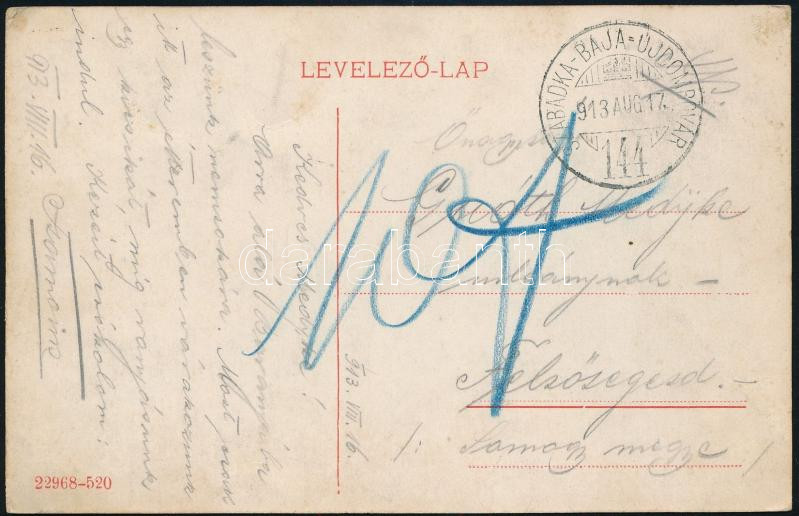 Leírás: 1913 Képeslap "SZABADKA-BAJA-ÚJDOMBOVÁR" vasúti mozgóposta bélyegzéssel