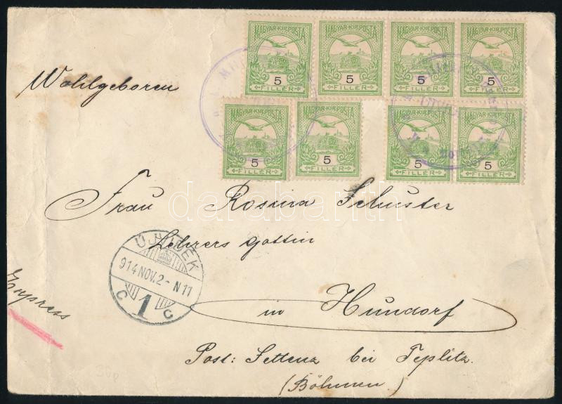 Leírás: 1914 Cenzúrázott levél 8 db Turul bélyeggel Újvidékről Németországba