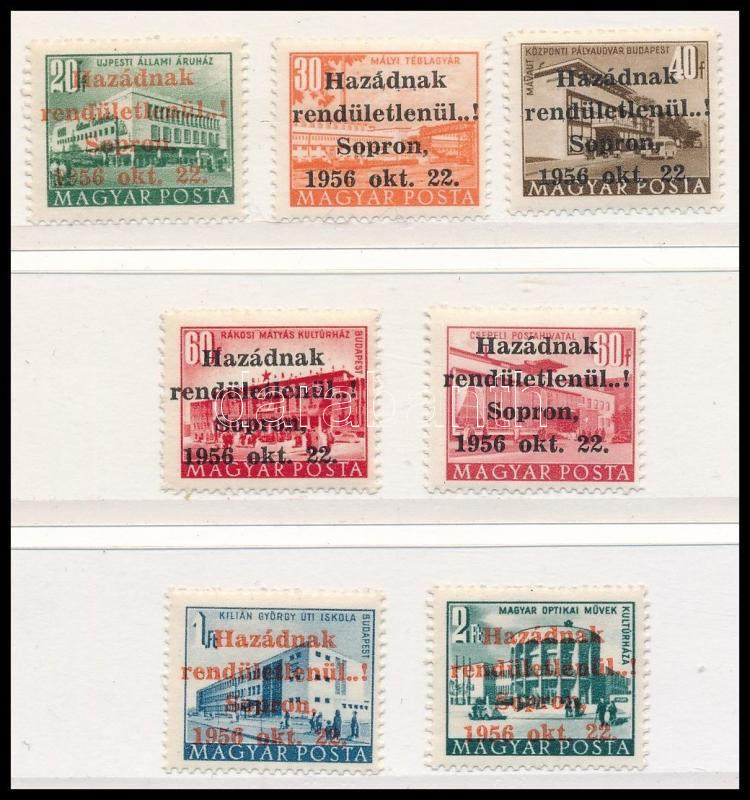 1956 Sopron 7 értékes sorozat https://www.darabanth.com/hu/513-Filatelia-kepeslap-numizmatika-mutargy-konyv-papirregiseg-ekszer-aukcio/513.0/Magyar-filatelia-es-postatortenet/1946-1956-kozotti-kiadasok~48/1956-Sopron-7-ertekes-sorozat~II3466717