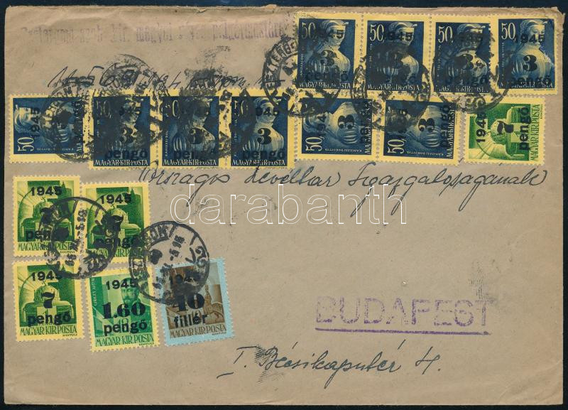 Leírás: 1945 (4. díjszabás) Levél 16 db bélyeggel Esztergomból Budapestre