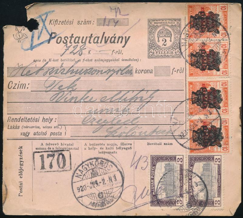 Leírás: 1920 Postautalvány 6 db bélyeggel "NAGYKŐRÖS" - "CZEGLÉD" / Money order