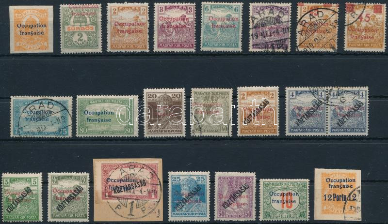 Leírás: Arad 1919 21 klf bélyeg Bodor vizsgálójellel, közte elcsúszott felülnyomások, apró lemezhibák (ca 20.000)