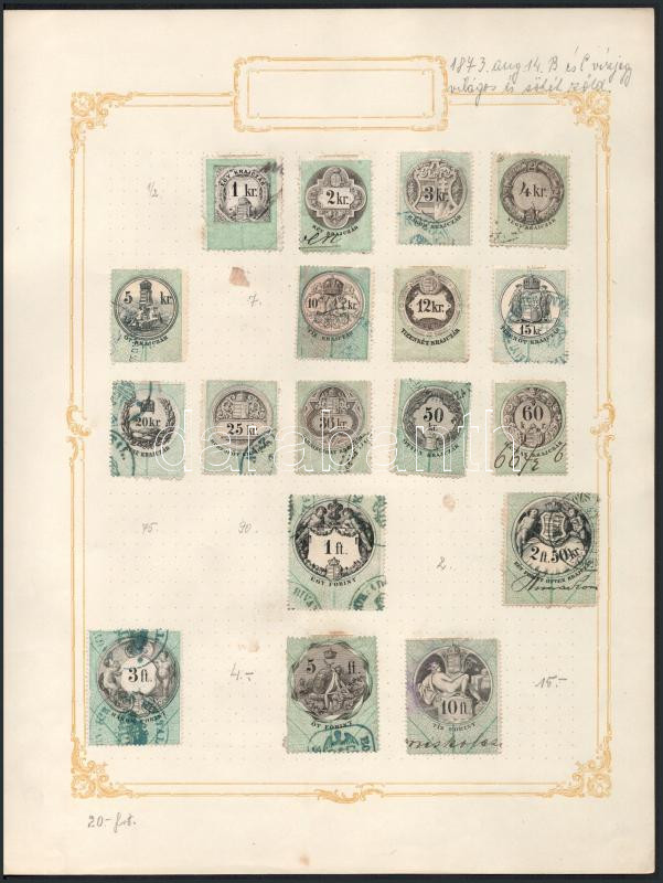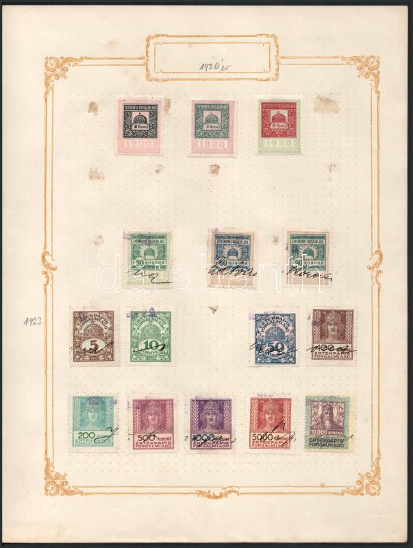 Leírás: 1854-1926 Tartalmas okmánybélyeg gyűjtemény a CM kiadásoktól a Korona kiadások végéig, benne sok magas érték. Kb 130 db