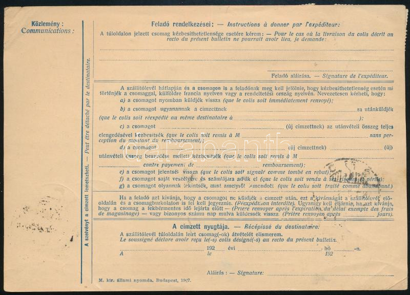 1928.09.08. Csomagszállító levél az USA-ba, négyszínű 4P 85f bérmentes... https://www.darabanth.com/hu/513-Filatelia-kepeslap-numizmatika-mutargy-konyv-papirregiseg-ekszer-aukcio/513.0/Magyar-filatelia-es-postatortenet/Pengo-idoszak-1926-1944~45/19280908-Csomagszallito-level-az-USA-ba-negyszinu-4P-85f-bermentesitessel-Keskeny-Ma~II3469877