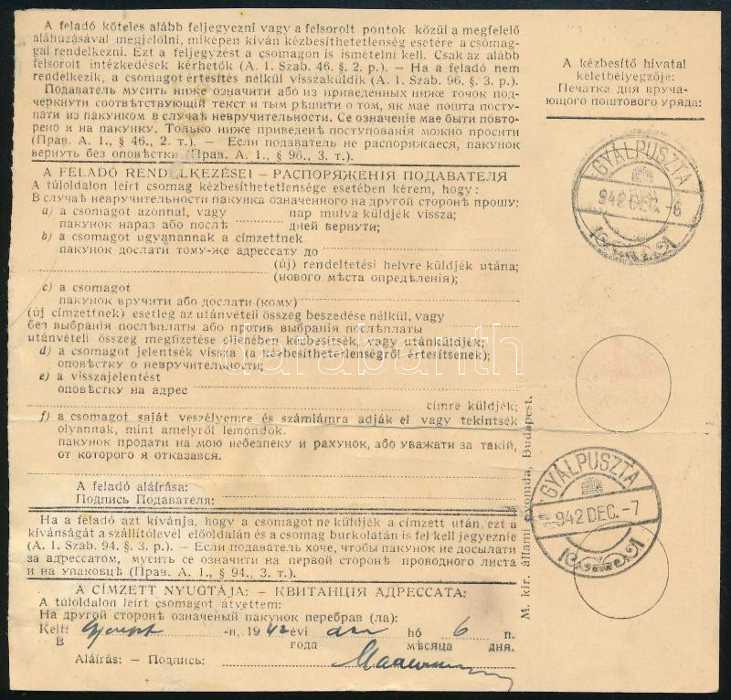 Leírás: 1942.12.05. Magyar-rutén nyelvű szállítólevél bérmentesítés nélkül feladva , 1P 10f-el portózva , rendkívül ritka űrlap!