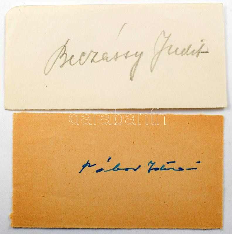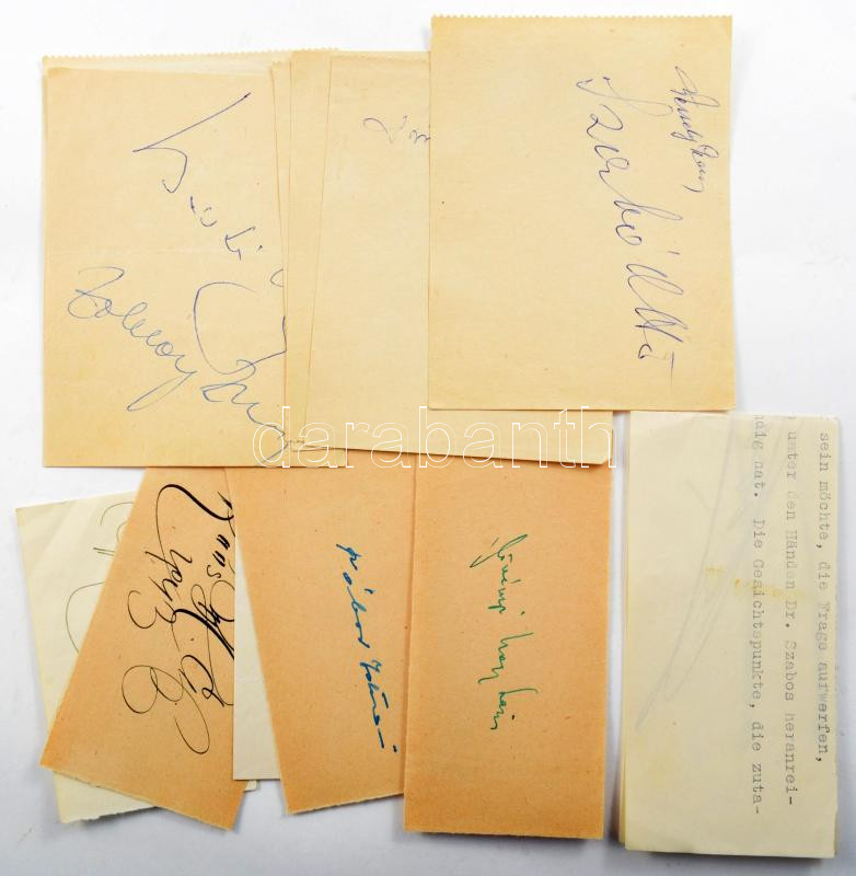 14 db író, színész, énekes aláírás kivágásokon: Koós Hutás Gergely, Kelly Anna, Buzássy Judit, Perneky, Básti Lajos, Gross Arnold, Raksányi Gellért, Szabó Ottó,